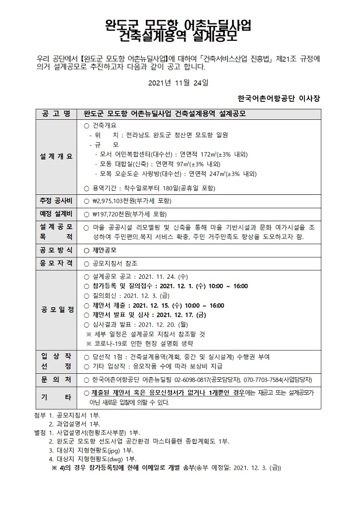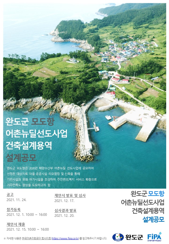 완도군 모도항 어촌뉴딜사업 건축설계용역 설계공모 공고